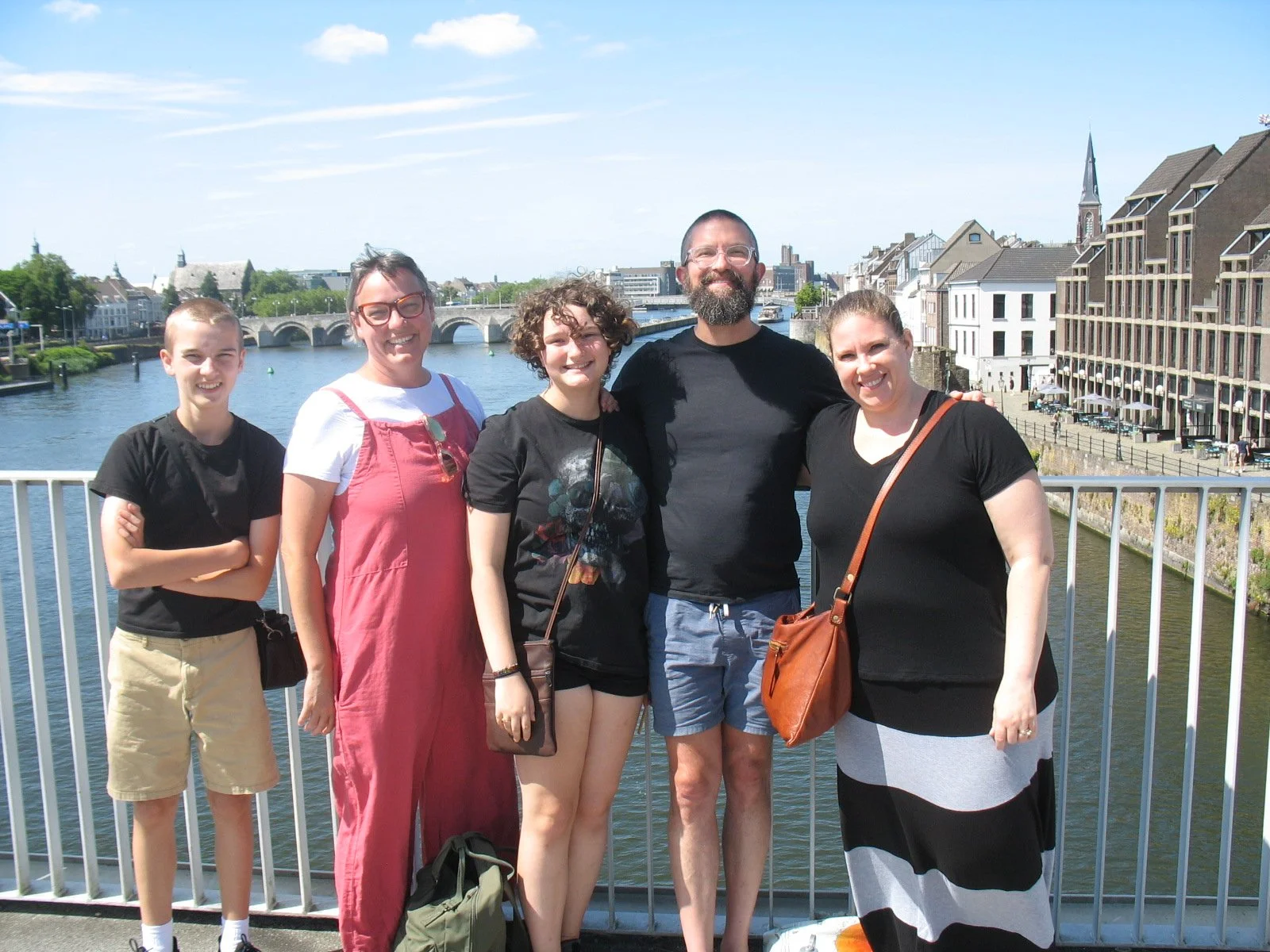 We stopped on the modern bridge over the Maas to take a photo. (photo: some random guy walking past who offered to take a photo with all of us in it, including Auntie Casey)