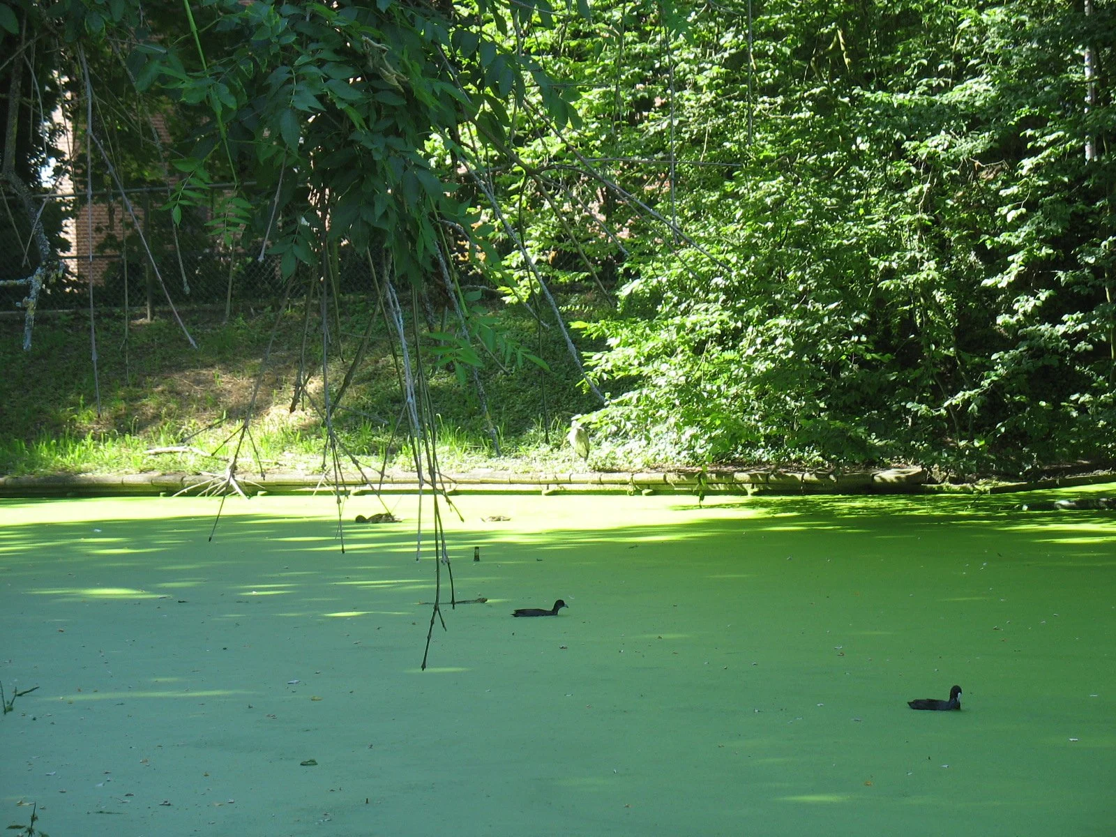 A very algae coated pond in the park. We think that the city hadn’t cleaned it because we spotted several nests that these coots were building. (photo: Dory)